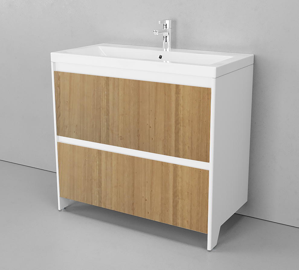 В напольных тумбах интегрированная влагостойкая опора с переднего края тумбы. Монолитная опора с небольшими регулировочными ножками обеспечивает легкую установку тумбы даже при наличии пристеночного плинтуса.