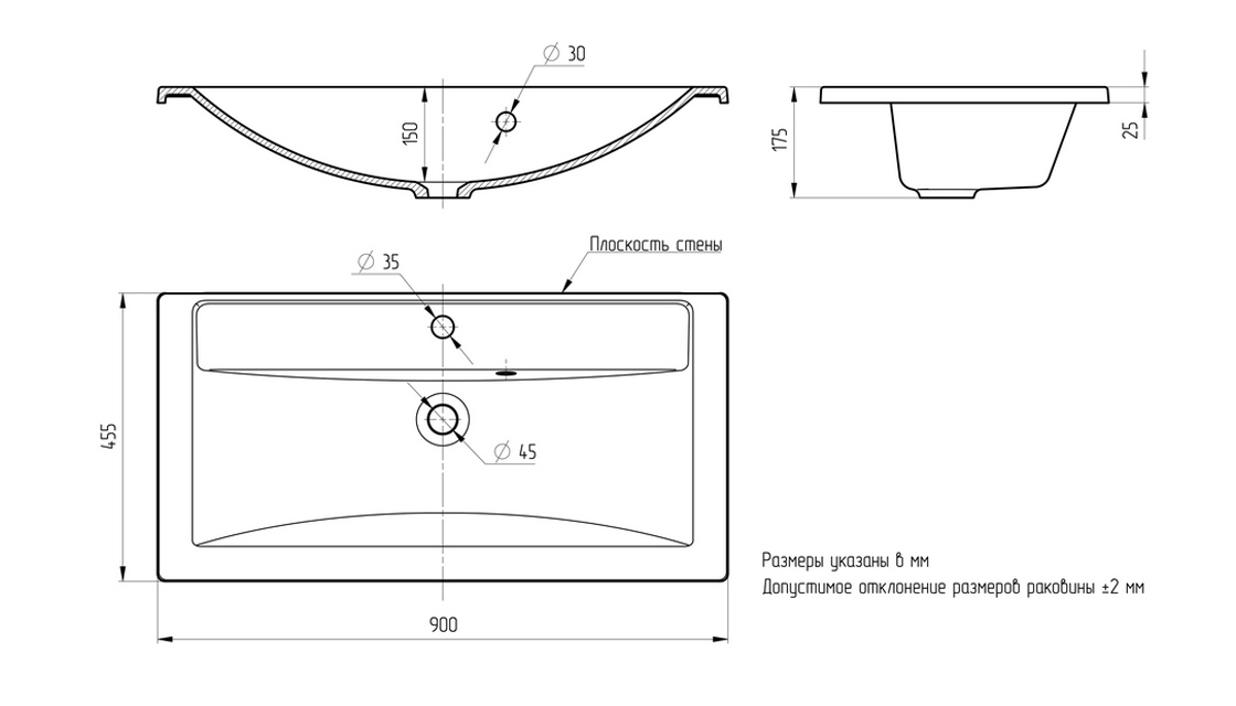 Ширина, мм 900 Глубина, мм 450 Высота, мм 755 Размер тумбы (ШxГxВ), мм 887x443x722 Размер раковины (ШxГxВ), мм 900х455х175 Материал и конструкция