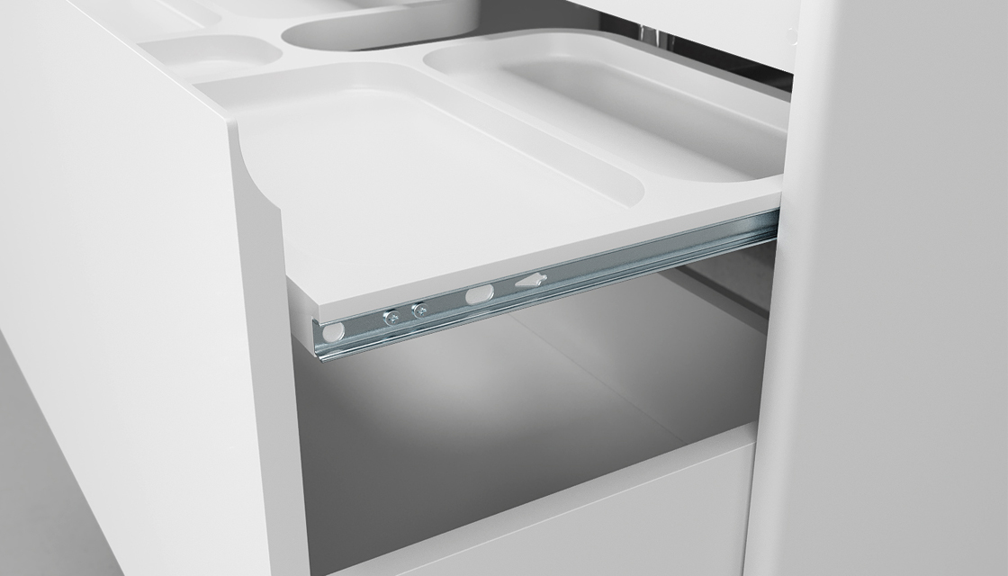 Высокие ящики с направляющими полного выдвижения позволяют максимально использовать весь объем ящика и хранить высокие флаконы. Открываются благодаря нажимным механизмам.