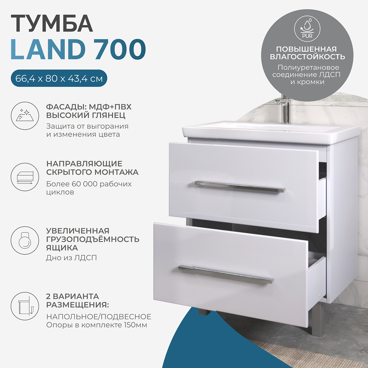 Ширина, мм 700 Глубина, мм 424 Высота, мм 800 Размер тумбы (ШxГxВ), мм 664x434x700 Размер раковины (ШxГxВ), мм 700x450x175 Материал и конструкция