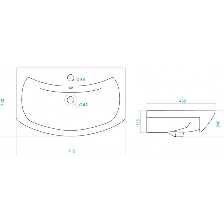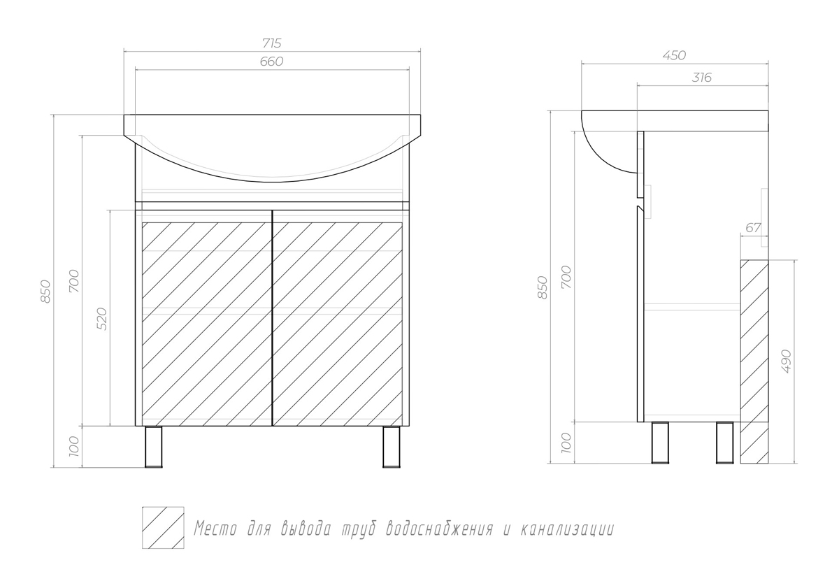 Ширина, мм 700 Глубина, мм 450 Высота, мм 850 Высота тумбы с раковиной, мм 750 Размер тумбы (ШxГxВ), мм 660x316x700 Размер раковины (ШxГxВ), мм 715x450x200 Материал и конструкция