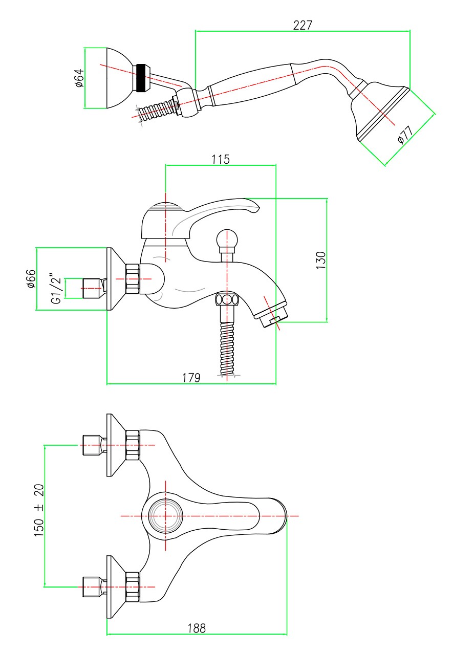 Монтаж настенный Тип управления рычажный Стандарт подводки 1/2" Тип подводки жесткая Механизм керамический картридж Отверстия для монтажа 3 отверстия Излив традиционный Вращение излива фиксированный Вес, кг 3 Внешнее исполнение